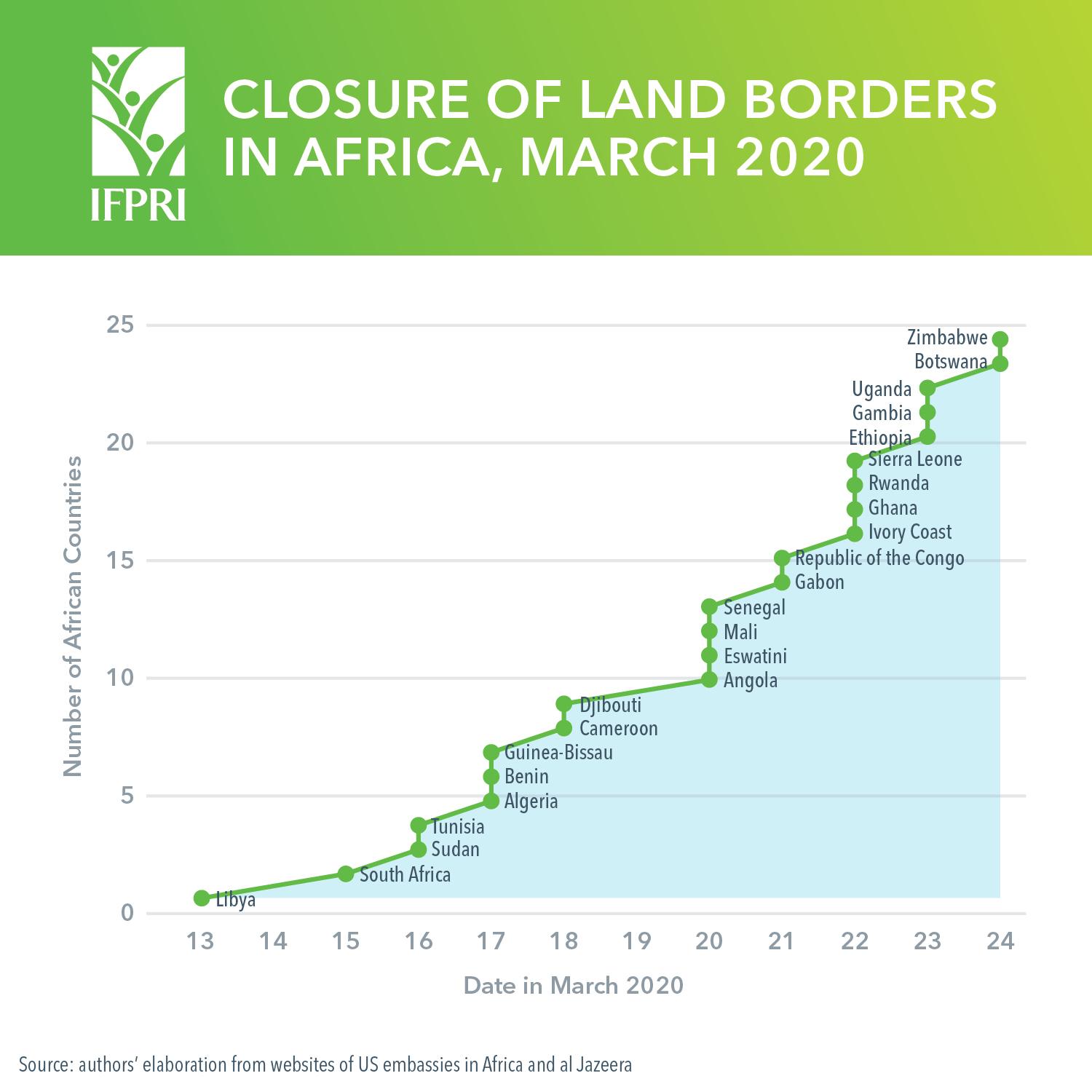 Most African countries have closed land borders to travelers, while still allowing freight to pass under tighter controls, which sometimes allow the movement of only agricultural and food products. Over one 10-day period in March, 25 African countries imposed such measures on land borders (see figure). Almost all these countries have also suspended the arrival of international flights, at least from countries particularly affected by the virus. Many governments have also imposed curfews.