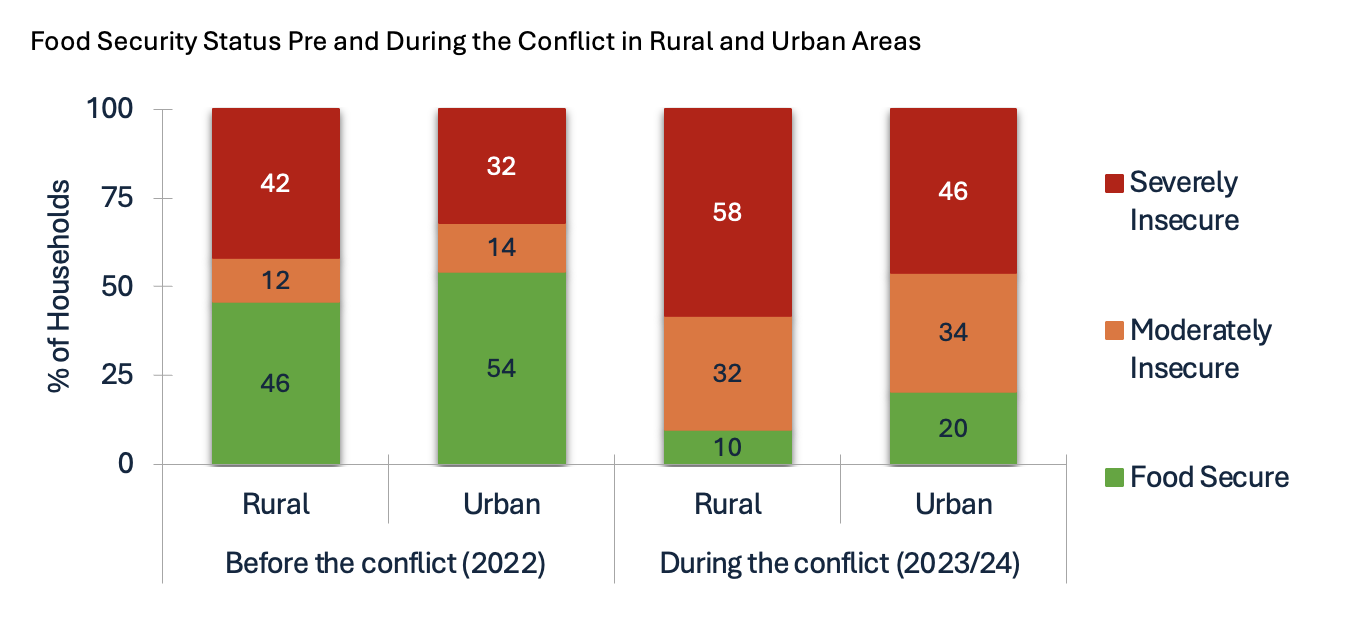 Food security has worsened dramatically, with only 9%-20% of households remaining food-secure, according to data presented by Oliver K. Kirui, IFPRI Research Fellow (Figure 1). Rural areas, larger households, displaced populations, and female-headed households are particularly vulnerable. Conflict-sensitive interventions that combine emergency aid with strategies for agricultural recovery are an urgent priority, Kirui said.